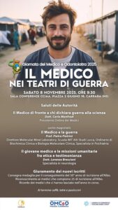 Gli interventi si sono chiusi con la testimonianza del dottor Lorenzo Bresciani che ha svolto attività di medico volontario in zone di conflitto e ha partecipato recentemente alla missione della Flotilla a Gaza. Dalla sua toccante narrazione è emersa l’importanza di non accettare politiche di disumanizzazione e di difendere il diritto universale alla cura. Un intervento molto coinvolgente, a cui è seguito l’encomio solenne per il dottor Bresciani da parte dell’Ordine dei Medici. Il convegno si è concluso con la cerimonia di giuramento dei nuovi medici (per la maggior parte ragazze), la celebrazione dei medici a cinquanta e venticinque anni dall’iscrizione all’albo e il ricordo dei medici che sono mancati nel 2025.