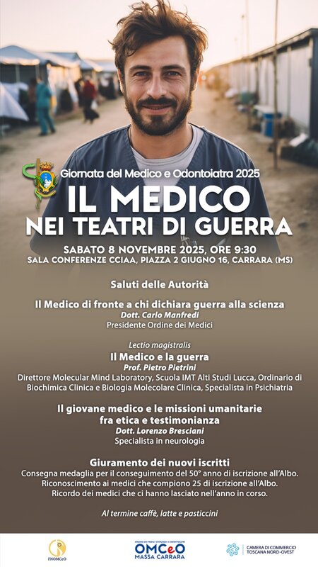 Il Liceo Classico Repetti ringrazia l’Ordine dei Medici della provincia di Massa-Carrara per aver offerto agli studenti della curvatura biomedica l’opportunità di partecipare alla Giornata del Medico e Odontoiatra 2025, dedicata al tema Il medico nei teatri di guerra, che si è svolta sabato 8 novembre, presso la Camera di commercio di Carrara. Hanno partecipato gli alunni iscritti alla curvatura biomedica delle classi 4A, 4B e 4C, che hanno potuto seguire interventi di alto valore formativo, strettamente legati all’attualità. La sessione è stata aperta dal dottor Carlo Manfredi, presidente dell’Ordine dei Medici, che ha richiamato l’attenzione sul ruolo della scienza oggi, in una società dove la disinformazione è dilagante. A seguire la lectio magistralis del prof. Pietro Pietrini, direttore del Molecular Mind Laboratory della Scuola di Alti Studi di Lucca, su Il Medico e la guerra, una sorta di “ossimoro”, come l’ha definito, perché il lavoro del medico è salvare vite mentre la guerra le annienta. Il professore ha dimostrato con evidenze scientifiche come la guerra lasci non solo ferite fisiche e psicologiche, ma anche impronte impresse nel DNA a seguito di modificazioni epigenetiche.